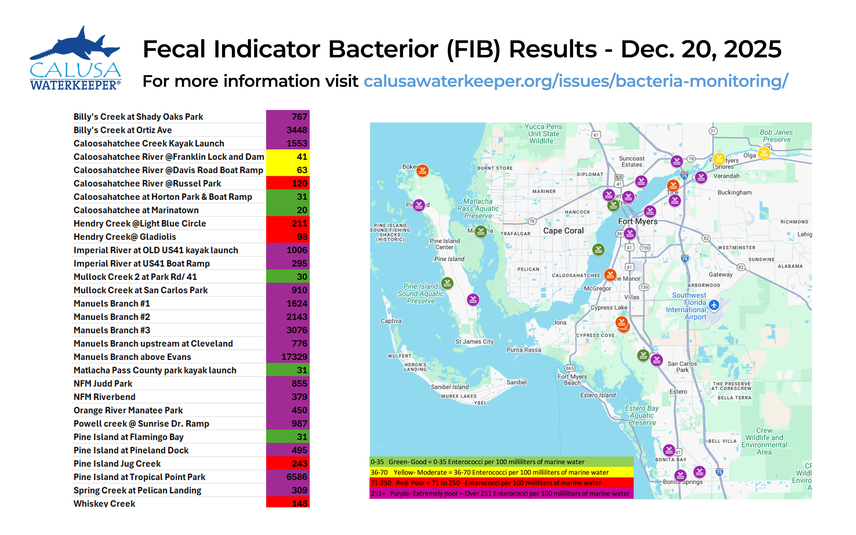 This month out of the 30 sites throughout the watershed tested by the Calusa Waterkeeper, 23% passed and 77% failed. The highest FIB count reported of 2,909 MPN at Manuel’s Branch will be discussed in a upcoming meeting.
